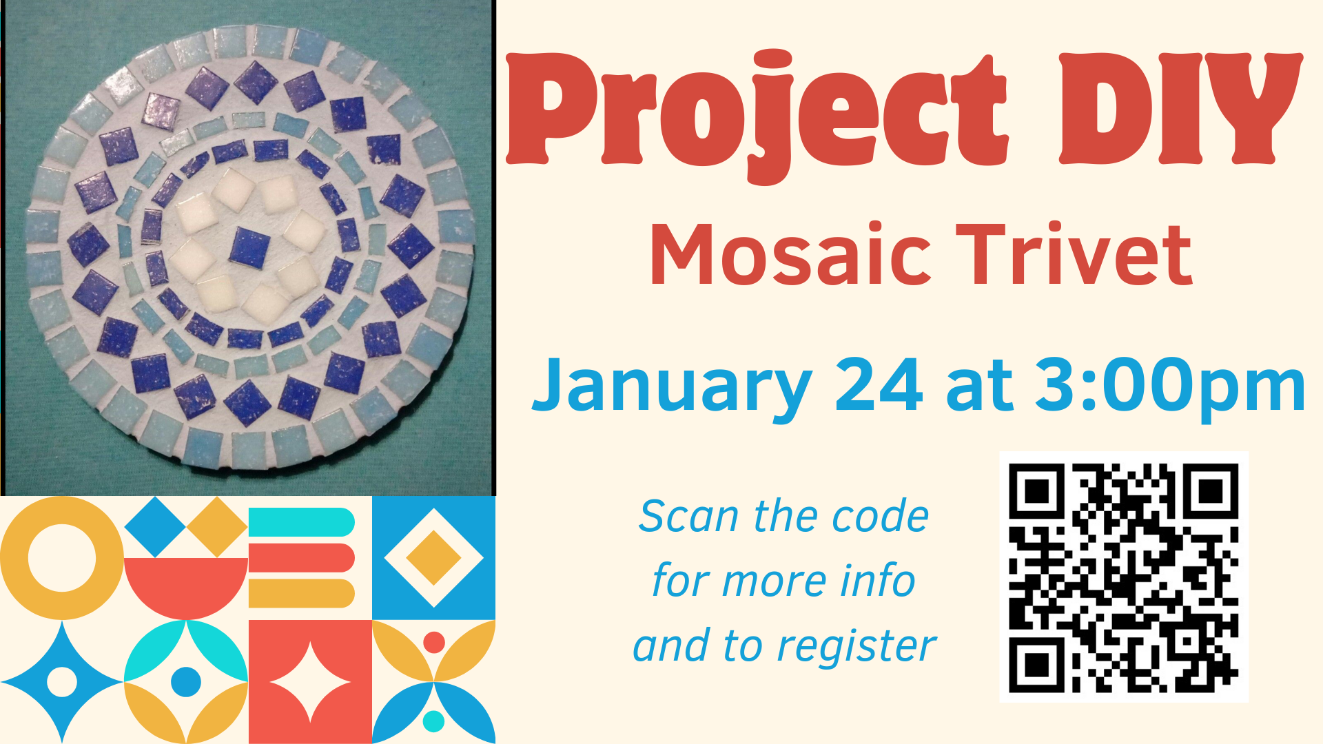 Join us for our next Project DIY as we create a mosaic trivet! A wide variety of color options will be available.
